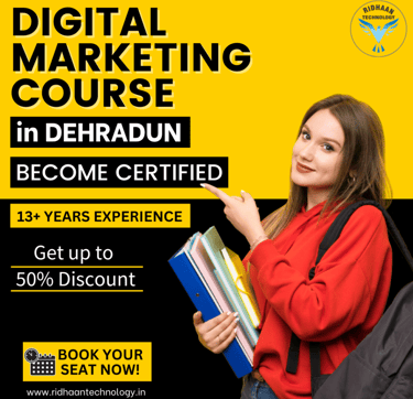 Join the top-rated digital marketing institute Dehradun, Uttarakhand by Ridhaan Technology, Learn SEO, Google & Meta Ads, Social media marketing, Website designing & development, YouTube monetization & management and more with live projects and 100% Placement support.