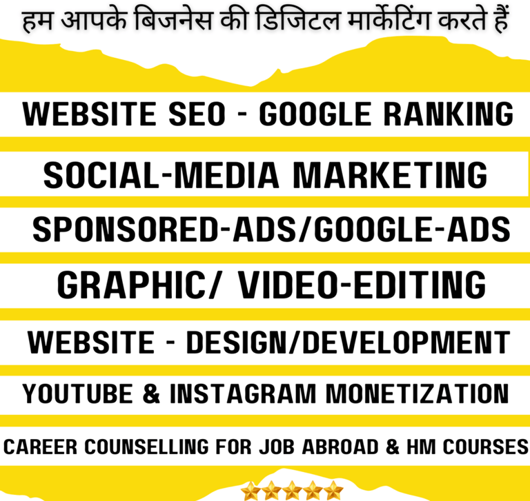 We offer SEO, social media marketing,graphic designing & video editing , email marketing, website design & development, youtube monetization & management, blog & article writing, content writing, affiliate marketing,sponsored ads ( meta & google ads ), and digital marketing course.